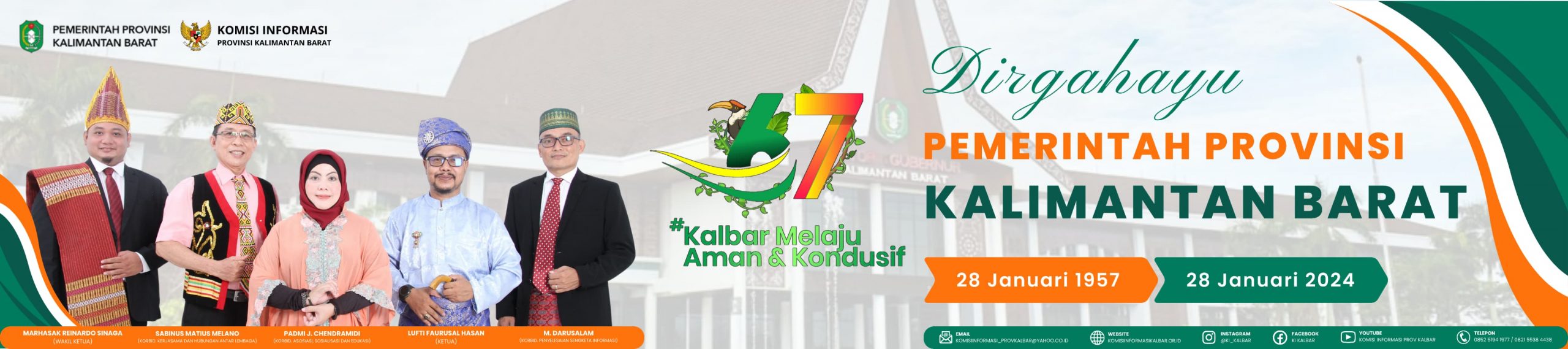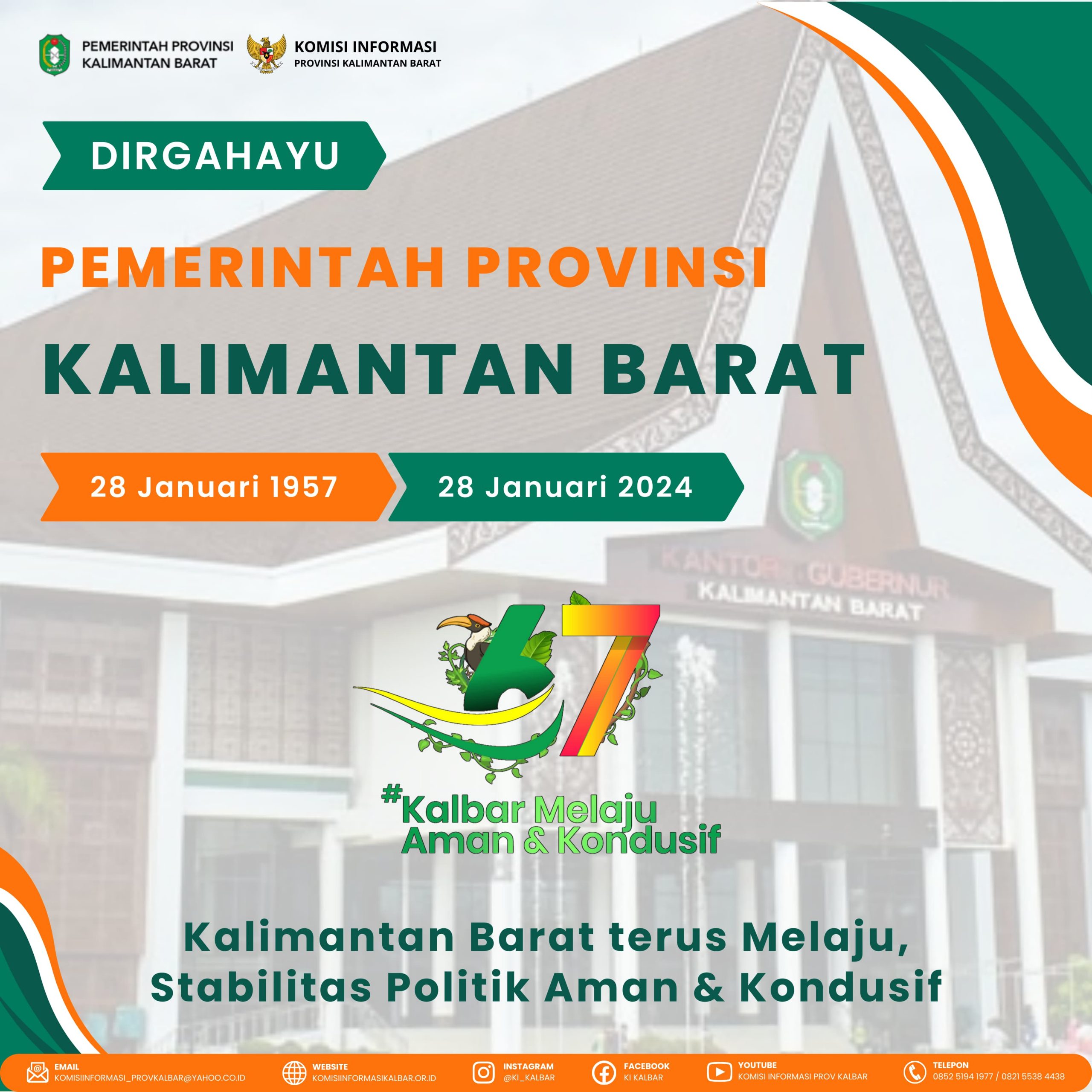 DIRGAHAYU PEMERINTAH PROVINSI KALIMANTAN BARAT 28 Jan 2024 kikalbar Berita, Galeri No comment DIRGAHAYU PEMERINTAH PROVINSI KALIMANTAN BARAT Komisi Informasi Provinsi Kalimantan Barat Mengucapkan: Dirgahayu Pemerintah Provinsi Kalimantan Barat ke- 67. Kalimantan Barat terus Melaju, Stabilitas Politik Aman dan Kondusif. #kikalbar #kalbarterbukadaninformatif2024 #dirgahayupemprovkalbar