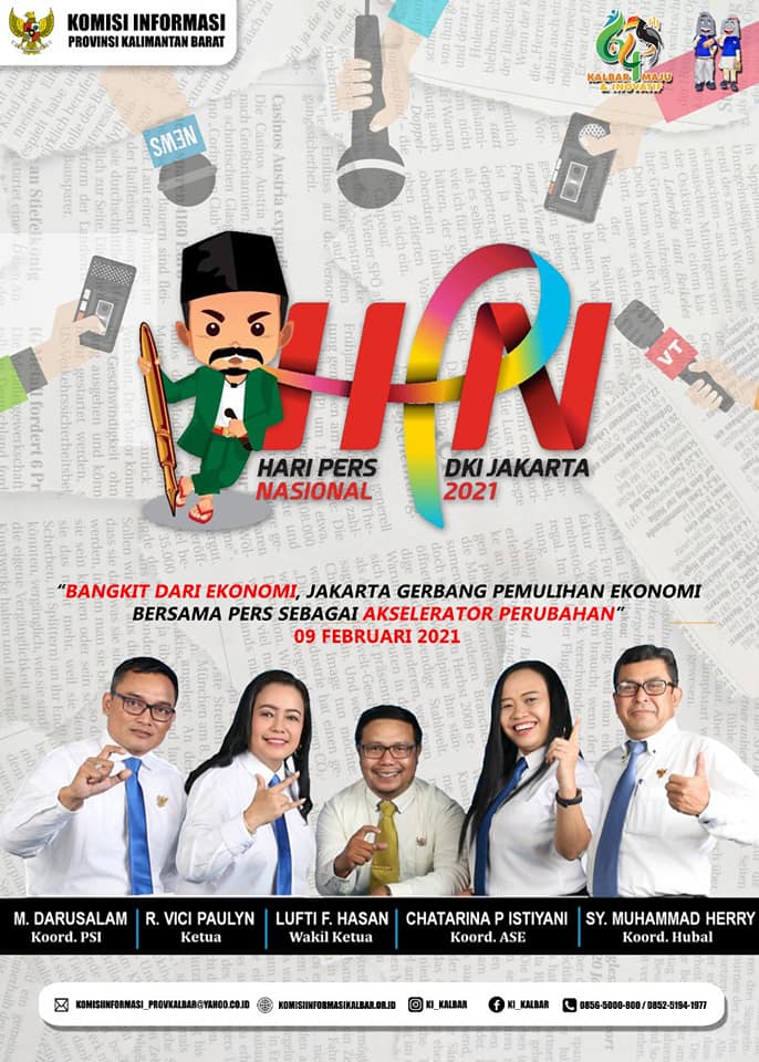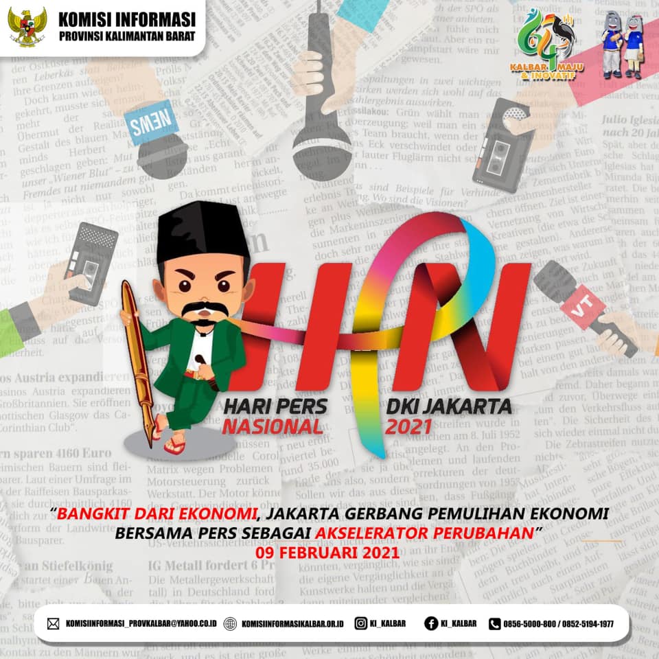 Komisi Informasi Provinsi Kalimantan Barat mengucapkan Selamat Hari Pers Nasional (HPN) Tahun 2021, di pusatkan di Jakarta, dengan Tema : “Bangkit Dari Ekonomi, Jakarta Gerbang Pemulihan Ekonomi Bersama Pers Sebagai Akselerator Perubahan”.