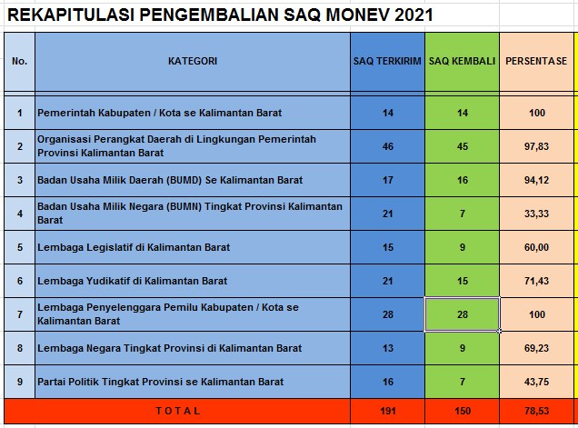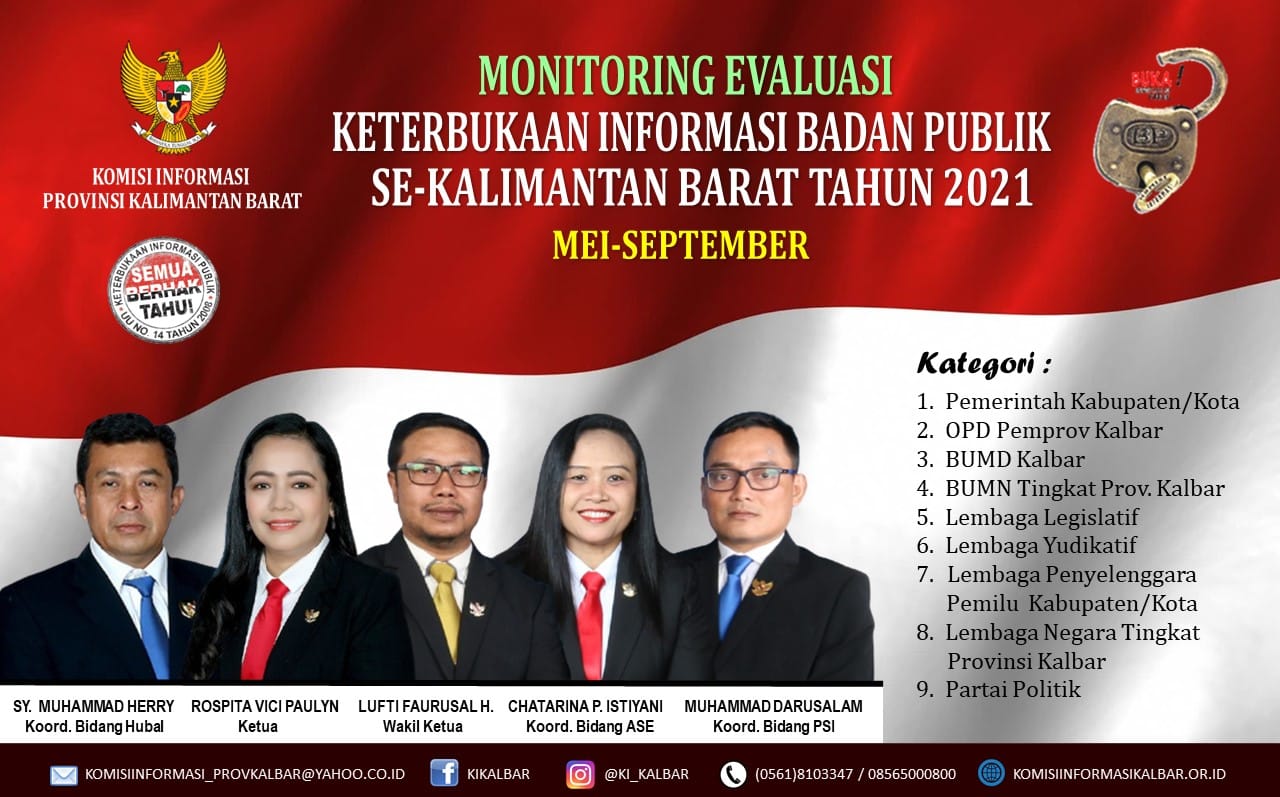 PONTIANAK, SP – Komisi Informasi Provinsi Kalbar (KI Kalbar) kembali melaksanakan Kegiatan Monitoring Evaluasi Keterbukaan Informasi Badan Publik se-Kalbar tahun 2021. Kegiatan ini dilaksanakan secara efektif mulai Mei hingga September 2021 dengan melakukan penyesuaian di setiap tahapannya terhadap perkembangan wabah pandemi Covid-19 yang sedang berlangsung.