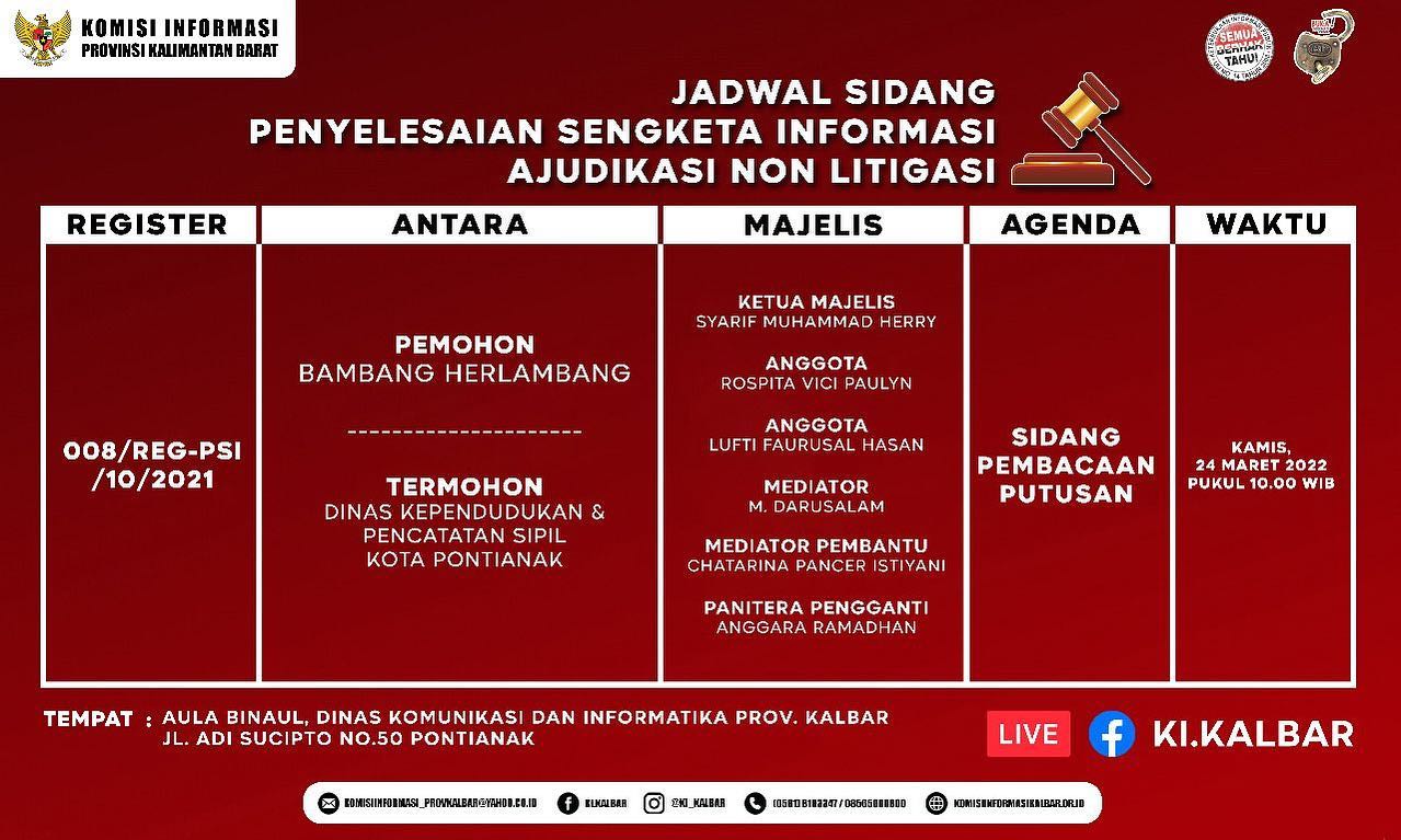 Komisi Informasi Provinsi Kalimantan Barat menggelar sidang penyelesaian sengketa informasi dengan agenda sidang Pembacaan Putusan Sengketa Informasi antara Sdr. Bambang Herlambang sebagai Pemohon dan Dinas Kependudukan dan Pencatatan Sipil Kota Pontianak sebagai Termohon.