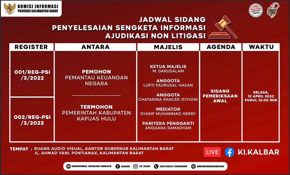 Komisi Informasi Provinsi Kalimantan Barat, pada hari ini Selasa (12/4/2022), kembali melakukan sidang Penyelesaian Sengketa Informasi antara Pemantau Keuangan Negara (PKN) sebagai Pemohon dengan Pemerintah Kabupaten Kapuas Hulu sebagai Termohon, mulai memasuki tahapan Pemeriksaan Awal.
