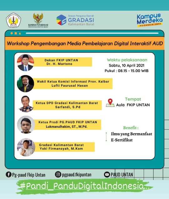 Gradasi (Generasi Digital Indonesia) DPD Kalimantan Barat bekerjasama dengan PG-PAUD FKIP Universitas Tanjungpura menyelenggarakan Workshop Pengembangan Media Pembelajaran Digital Interaktif Anak Usia Dini, Sabtu (10/4) di Aula FKIP Untan Pontianak.